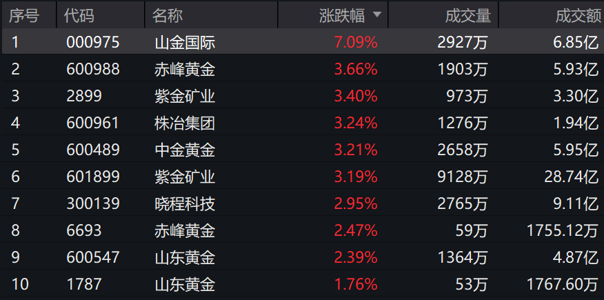 截至2025年12月11日 09:57广瑞网,中证沪深港黄金产业股票指数(931238)强势上涨1.80%,成分股山金国际(000975)领涨,赤峰黄金(600988)、株冶集团(600961)、紫金矿业(02899)、紫金矿业(601899)等个股跟涨。