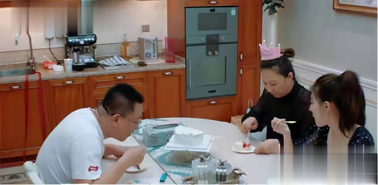 餐厅的设计风格与家中其他地方略有不同,采用开放式设计与厨房相邻。整体橱柜选用实木材质,质感十足。照片中,徐璐妈妈过生日,一家人温馨庆生的画面,仪式感满满。