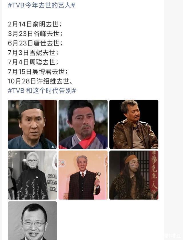 令人感慨的是,今年的TVB一直是噩耗频传,从年初俞明去世之后,每隔一段时日就会传出老演员离世的悲讯,截止目前已有7位TVB艺人去世,包括谷峰、唐佳、雪妮、周聪、吴博君、许绍雄,每一位都是大家耳熟能详的熟面孔,他们给大家带来了太多美好且隽永的荧幕回忆。