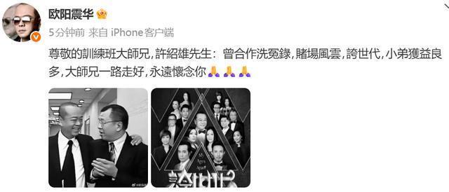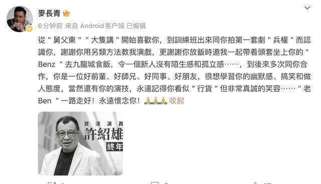 许绍雄生前为人和善,与人交好,是名副其实的“好人缘”,许绍雄离世的消息一经传出,诸多艺人纷纷发文予以悼念。