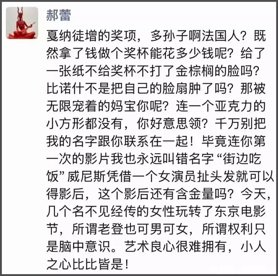 先简单了解一下网曝郝蕾朋友圈的内容,大致就是前半段内涵《狂野时代》能获戛纳电影节主竞赛单元评审团特别奖,是因为有人帮忙运作(撕奖)了,然后骂导演毕赣是妈宝男,后面还直接扫射辛芷蕾和白百何《春树》剧组风波,嘲讽辛芷蕾靠“扯头发”获奖。