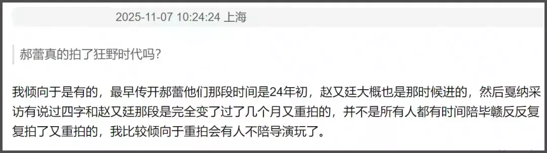 郝蕾这一波嘲讽来得猝不及防,网友纷纷猜测她不满原因。随后有网友爆料郝蕾也参演了《狂野时代》,只是后面闹掰了立盟策略,所以产生了不满。据悉,在电影拍摄初期,甚至入围戛纳之后,都还有大V在宣传的时候,爆料郝蕾会参演电影。