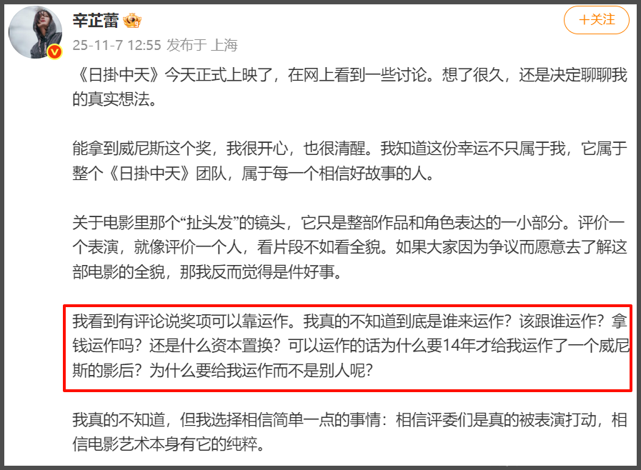 辛芷蕾坦言:“我看到有评论说奖项可以靠运作。可以运作的话为什么要14年才给我运作了一个威尼斯的影后?”最后辛芷蕾坦言:“相信评委们是真的被表演打动,相信电影艺术本身有它的纯粹。”